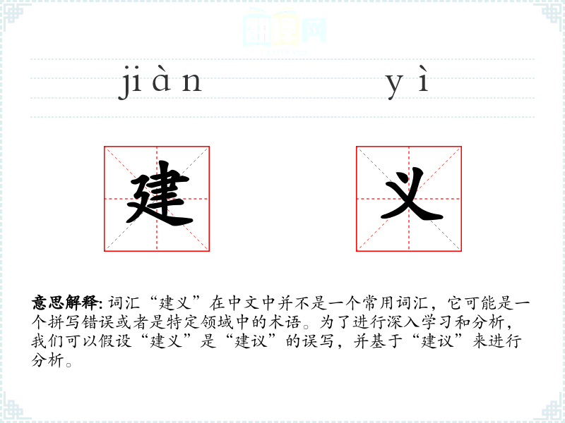 词汇“建义”在中文中并不是一个常用词汇,它可能是一个拼写错误或者是特定领域中的术语。为了进行深入学*和分析,我们可以假设“建义”是“建议”的误写,并基于“建议”来进行分析。