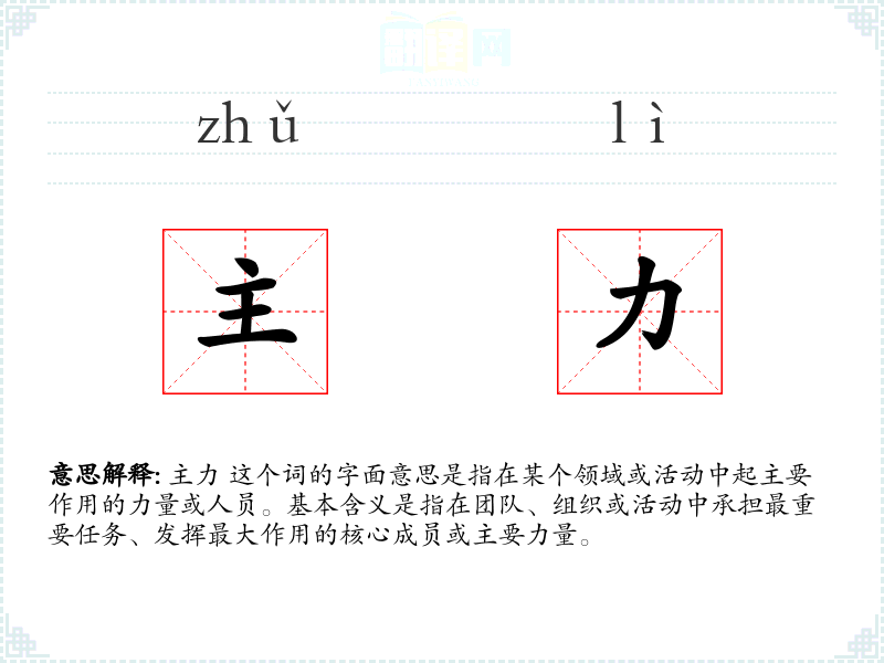 主力 这个词的字面意思是指在某个领域或活动中起主要作用的力量或人员。基本含义是指在团队、组织或活动中承担最重要任务、发挥最大作用的核心成员或主要力量。