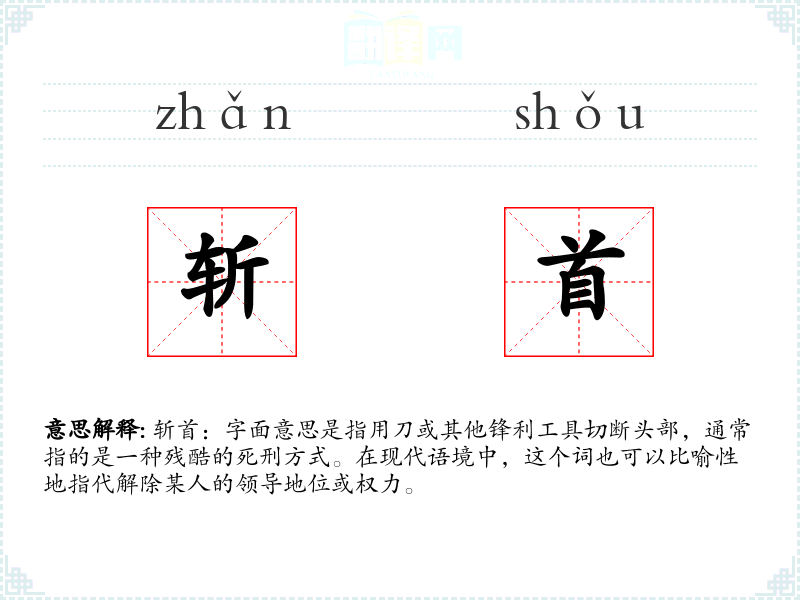 - 专业领域:在法律或历史学中,“斩首”可能特指古代的死刑执行方式。