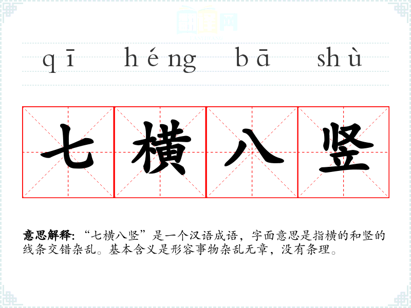 “七横八竖”是一个汉语成语,字面意思是指横的和竖的线条交错杂乱。基本含义是形容事物杂乱无章,没有条理。