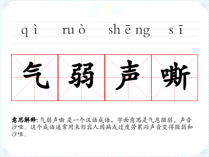 气弱声嘶 是一个汉语成语,字面意思是气息微弱,声音沙哑。这个成语通常用来形容人因病或过度劳累而声音变得微弱和沙哑。