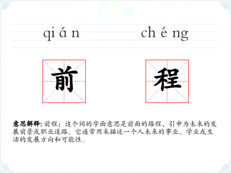 - 专业领域:在职业规划或教育领域,“前程”指的是个人职业发展的路径和目标。