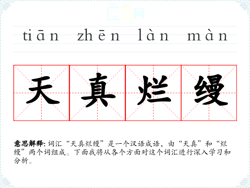 词汇“天真烂缦”是一个汉语成语,由“天真”和“烂缦”两个词组成。下面我将从各个方面对这个词汇进行深入学*和分析。
