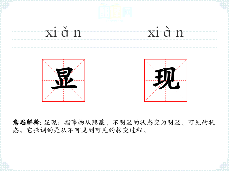 显现:指事物从隐蔽、不明显的状态变为明显、可见的状态。它强调的是从不可见到可见的转变过程。