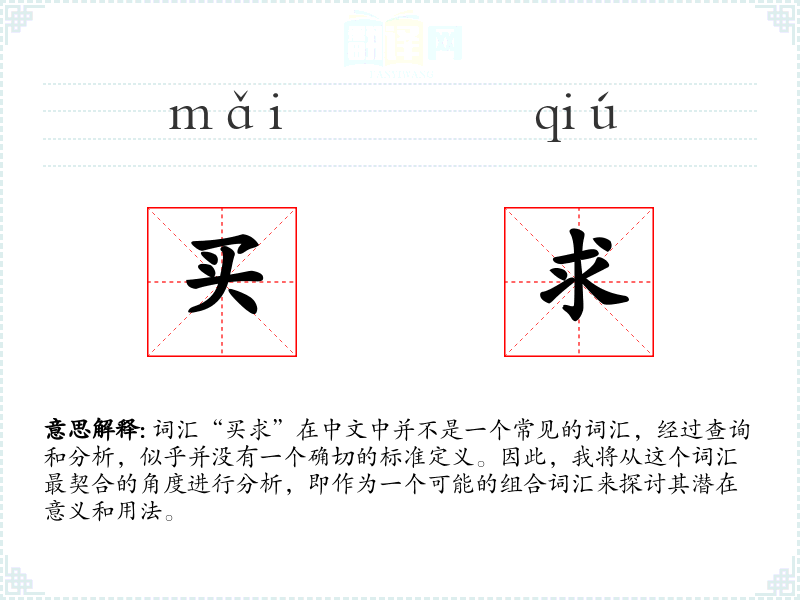 “买求”可以理解为“购买”和“请求”的组合,可能意味着通过购买的方式来满足某种请求或需求。然而,这个解释较为牵强,因为在现代汉语中并没有广泛使用这个词汇的证据。