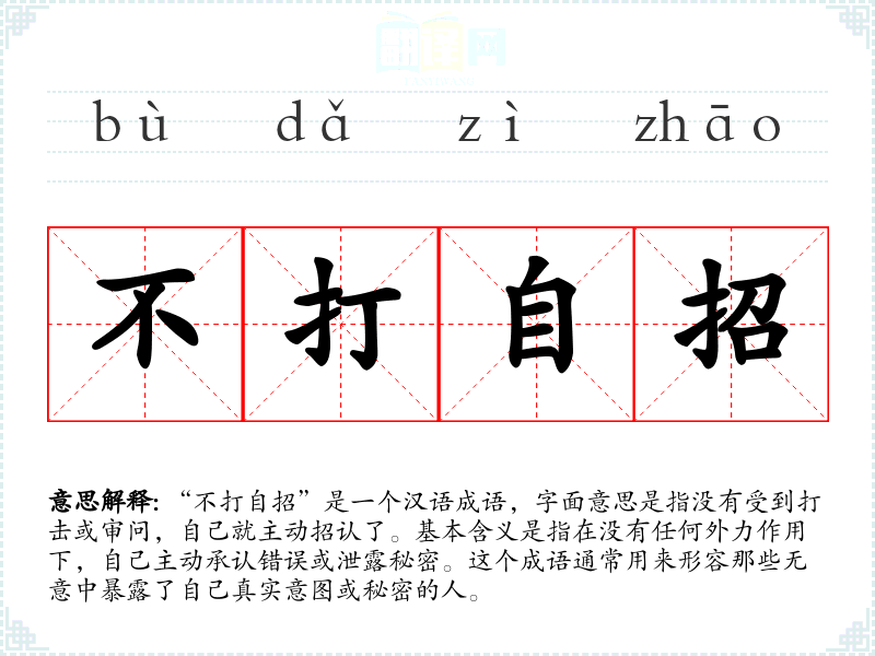 “不打自招”是一个汉语成语,字面意思是指没有受到打击或审问,自己就主动招认了。基本含义是指在没有任何外力作用下,自己主动承认错误或泄露秘密。这个成语通常用来形容那些无意中暴露了自己真实意图或秘密的人。
