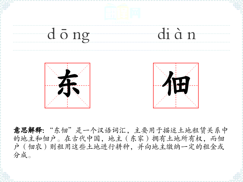 “东佃”是一个汉语词汇,主要用于描述土地租赁关系中的地主和佃户。在古代**,地主(东家)拥有土地所有权,而佃户(佃农)则租用这些土地进行耕种,并向地主缴纳一定的租金或分成。