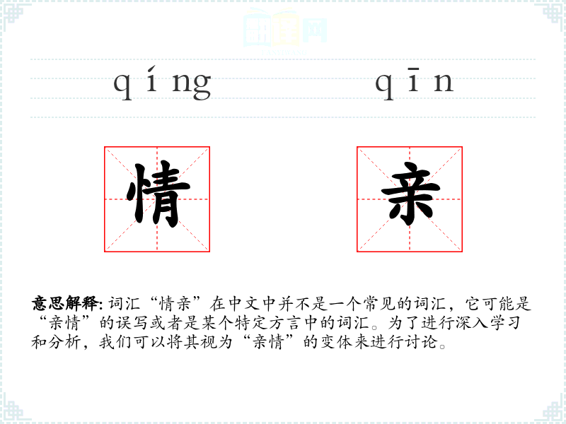 词汇“情亲”在中文中并不是一个常见的词汇,它可能是“亲情”的误写或者是某个特定方言中的词汇。为了进行深入学*和分析,我们可以将其视为“亲情”的变体来进行讨论。
