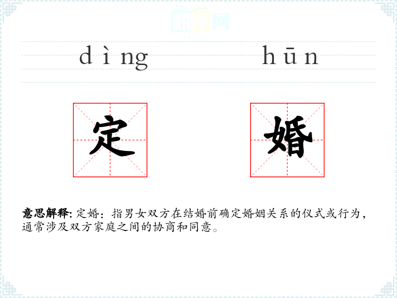 - 词源:“定婚”一词源自汉语,由“定”和“婚”两个字组成,分别表示确定和婚姻。