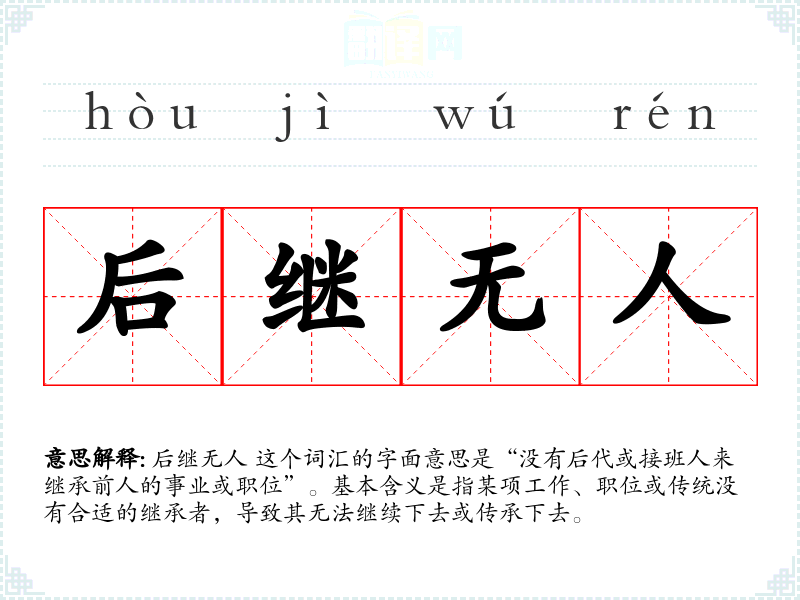 后继无人 这个词汇的字面意思是“没有后代或接班人来继承前人的事业或职位”。基本含义是指某项工作、职位或传统没有合适的继承者,导致其无法继续下去或传承下去。