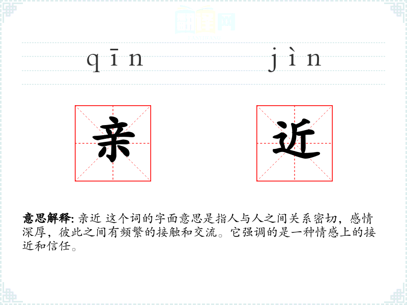 亲近 这个词的字面意思是指人与人之间关系密切,感情深厚,彼此之间有频繁的接触和交流。它强调的是一种情感上的接近和信任。