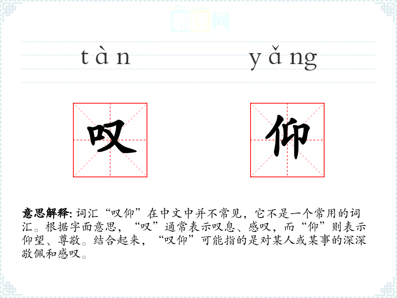- “叹仰”是一个表达深切敬意和极高评价的词汇,虽然在日常交流中不常用,但在文学和特定文化背景下有其独特的价值和意义。在学*语言和表达时,了解和掌握这样的词汇可以丰富表达方式,增强语言的深度和多样性。