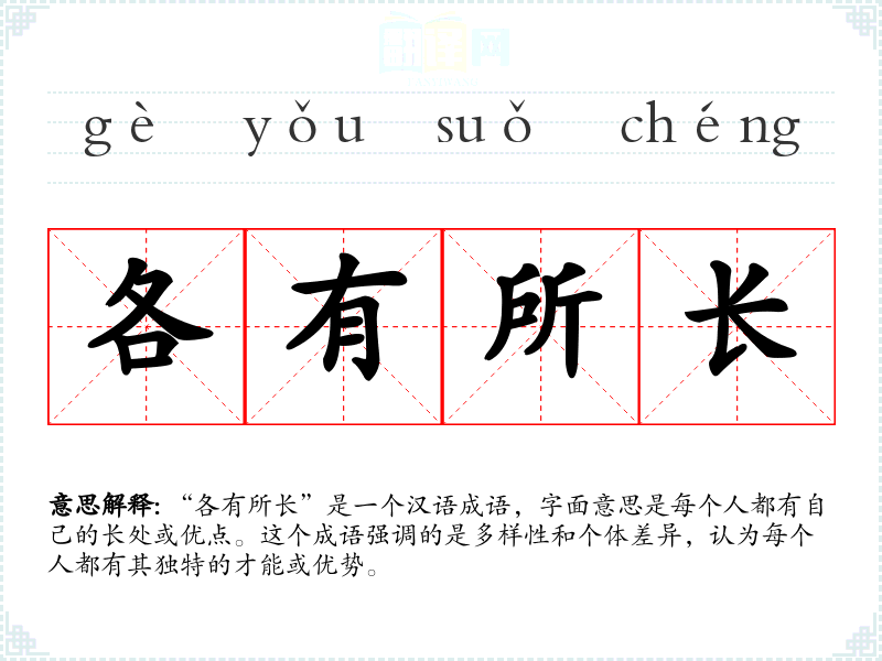 “各有所长”是一个汉语成语,字面意思是每个人都有自己的长处或优点。这个成语强调的是多样性和个体差异,认为每个人都有其独特的才能或优势。
