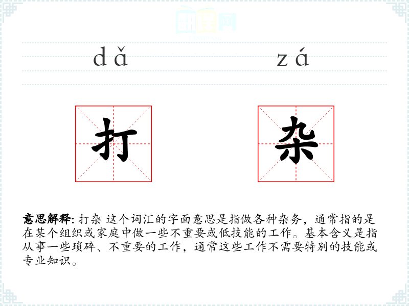 “打杂”这个词源于汉语,由“打”和“杂”两个字组成。在古代,这个词可能更多指的是家庭中的杂务,随着时间的推移,其含义扩展到了更广泛的工作领域。