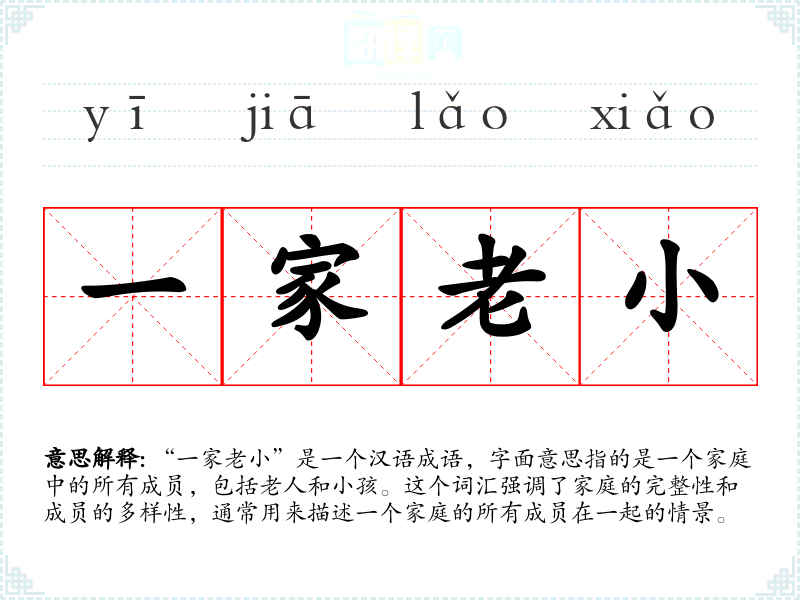 “一家老小”是一个汉语成语,字面意思指的是一个家庭中的所有成员,包括老人和小孩。这个词汇强调了家庭的完整性和成员的多样性,通常用来描述一个家庭的所有成员在一起的情景。