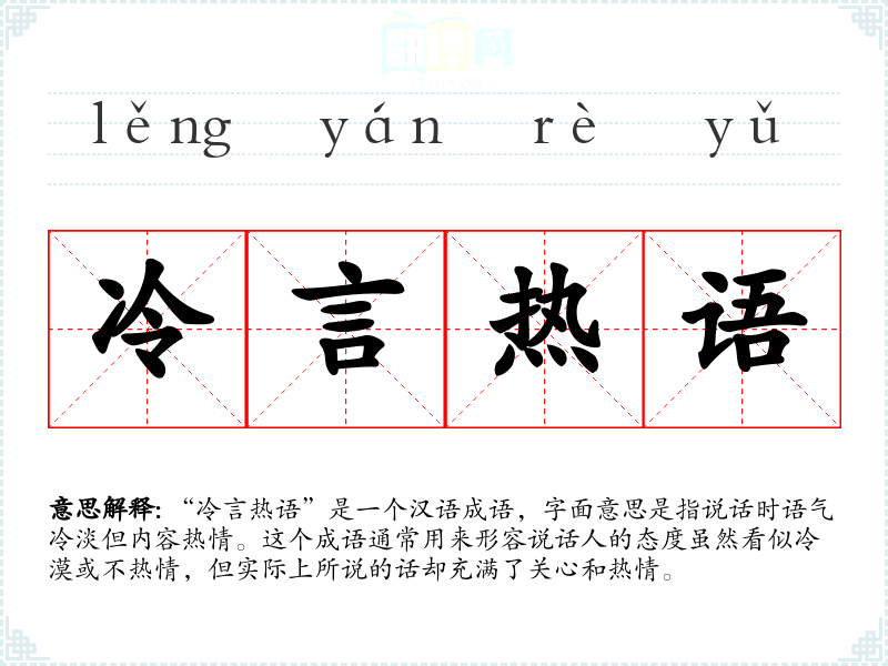 “冷言热语”是一个汉语成语,字面意思是指说话时语气冷淡但内容热情。这个成语通常用来形容说话人的态度虽然看似冷漠或不热情,但实际上所说的话却充满了关心和热情。
