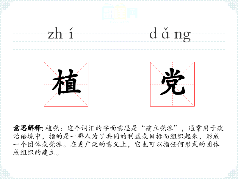 植党:这个词汇的字面意思是“建立党派”,通常用于政治语境中,指的是一群人为了共同的利益或目标而组织起来,形成一个团体或党派。在更广泛的意义上,它也可以指任何形式的团体或组织的建立。