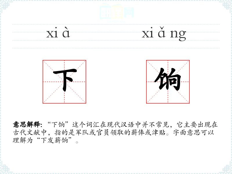 - 反义词:无(因为“下饷”是一个特定历史时期的词汇,现代汉语中没有直接的反义词)