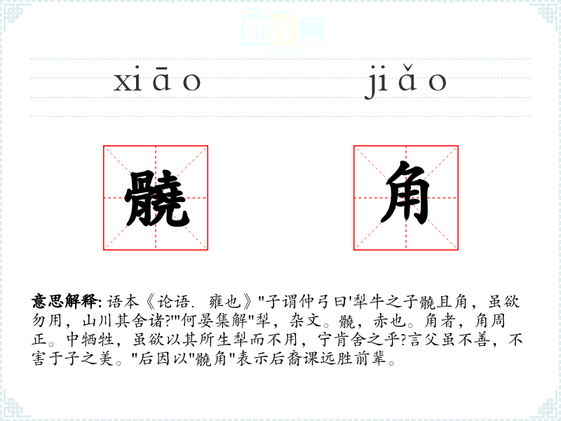 1.语本《论语.雍也》"子谓仲弓曰'犁牛之子髐且角,虽欲勿用,山川其舍诸?'"何晏集解"犁,杂文。髐,赤也。角者,角周正。中牺牲,虽欲以其所生犁而不用,宁肯舍之乎?言父虽不善,不害于子之美。"后因以"髐角"表示后裔课远胜前辈。