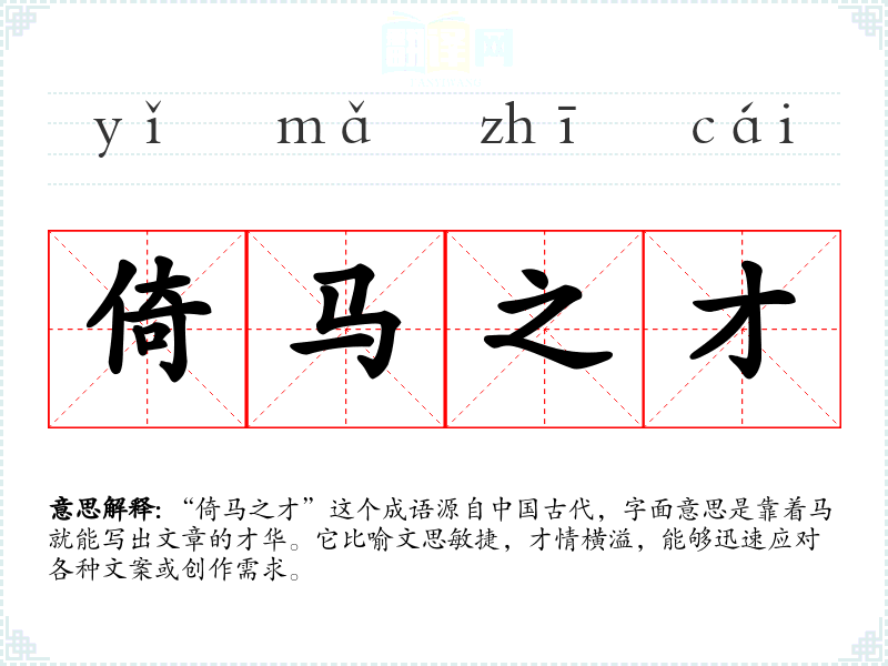 “倚马之才”这个成语源自**古代,字面意思是靠着马就能写出文章的才华。它比喻文思敏捷,才情横溢,能够迅速应对各种文案或创作需求。