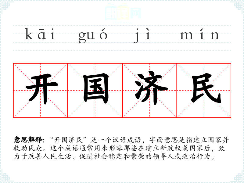 “开国济民”是一个汉语成语,字面意思是指建立国家并救助民众。这个成语通常用来形容那些在建立新政权或国家后,致力于改善人民生活、促进社会稳定和繁荣的领导人或政治行为。