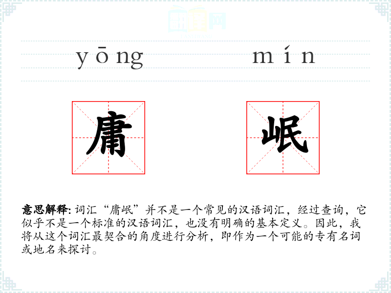 由于“庸岷”不是一个标准的汉语词汇,我们无法给出其字面意思和基本含义。它可能是某个特定地区、山脉、河流或其他地理实体的名称,或者是某个特定文化或历史背景下的专有名词。