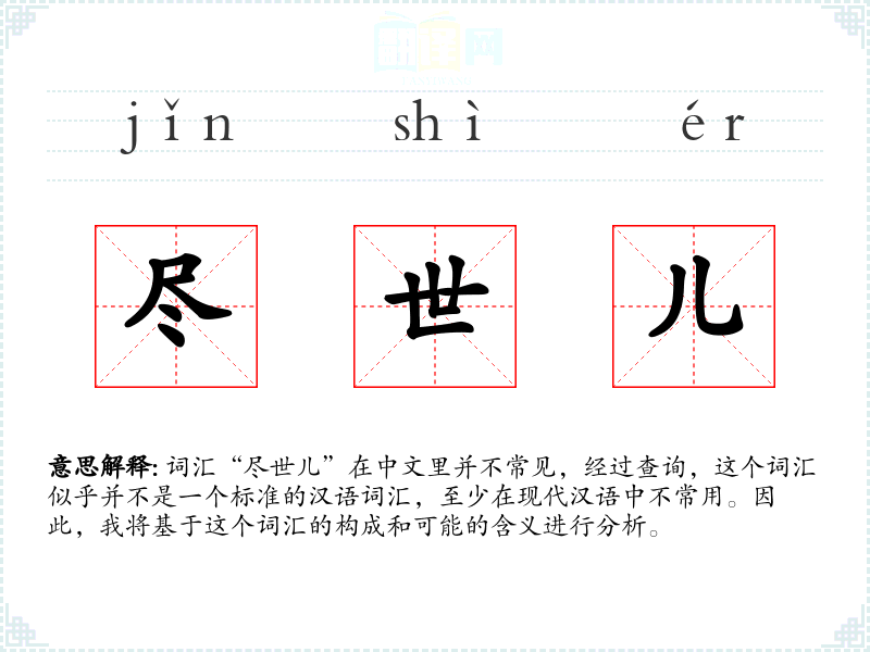 由于“尽世儿”不是一个标准词汇,它在不同语境下的使用非常有限。如果存在使用,可能是在某些方言或特定社群的口语中,用来强调某事物的普遍性或全面性。