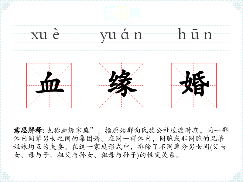 1.也称血缘家庭”。指原始群向氏族公社过渡时期,同一群体内同辈男女之间的集团婚。在同一群体内,同胞或非同胞的兄弟姐妹均互为夫妻。在这一家庭形式中,排除了不同辈分男女间(父与女、母与子、祖父与孙女、祖母与孙子)的性交关系。