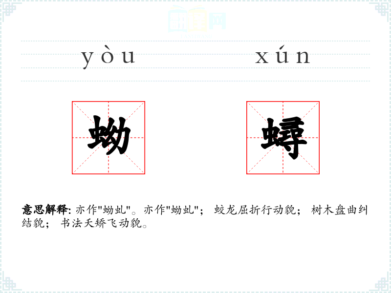 亦作"蚴虬"。亦作"蚴虬"; 蛟龙屈折行动貌; 树木盘曲纠结貌; 书法夭矫飞动貌。
