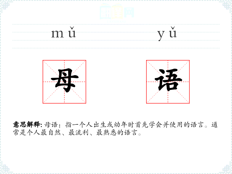 - 词源:“母语”一词由“母”和“语”组成,“母”指母亲,“语”指语言,合起来表示由母亲传授的语言。