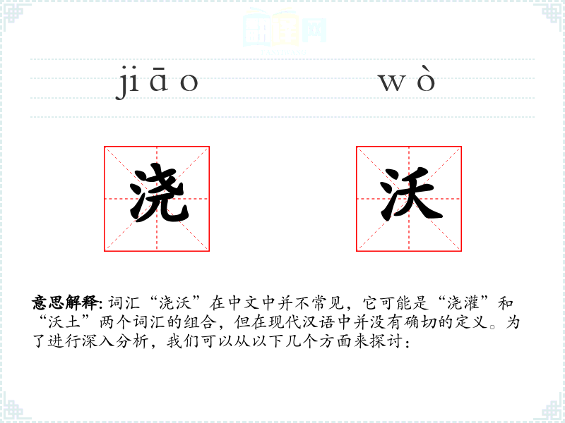 词汇“浇沃”在中文中并不常见,它可能是“浇灌”和“沃土”两个词汇的组合,但在现代汉语中并没有确切的定义。为了进行深入分析,我们可以从以下几个方面来探讨: