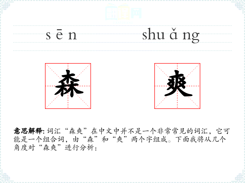 - 词源:由“森”和“爽”两个常用汉字组合而成。