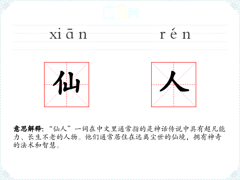 “仙人”一词在中文里通常指的是神话传说中具有超凡能力、长生不老的人物。他们通常居住在远离尘世的仙境,拥有神奇的法术和智慧。