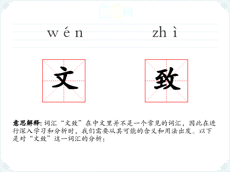 词汇“文致”在中文里并不是一个常见的词汇,因此在进行深入学*和分析时,我们需要从其可能的含义和用法出发。以下是对“文致”这一词汇的分析: