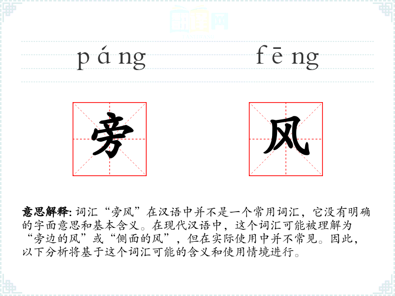 由于“旁风”不是一个标准词汇,我们无法给出一个确切的基本定义。它可能被理解为描述风从侧面吹来的情况,但在现代汉语中并不常用。