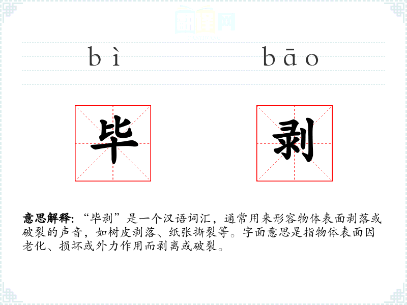 “毕剥”是一个汉语词汇,通常用来形容物体表面剥落或破裂的声音,如树皮剥落、纸张撕裂等。字面意思是指物体表面因老化、损坏或外力作用而剥离或破裂。