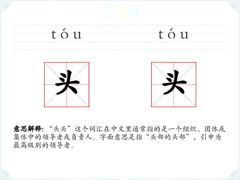 “头头”这个词汇在中文里通常指的是一个组织、团体或集体中的领导者或负责人。字面意思是指“头部的头部”,引申为最高级别的领导者。