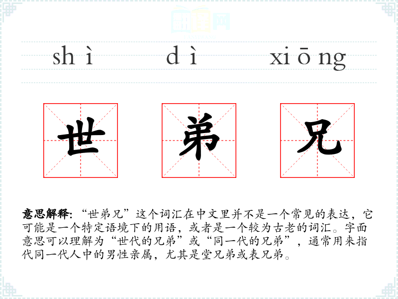 “世弟兄”这个词汇在中文里并不是一个常见的表达,它可能是一个特定语境下的用语,或者是一个较为古老的词汇。字面意思可以理解为“世代的兄弟”或“同一代的兄弟”,通常用来指代同一代人中的男性亲属,尤其是堂兄弟或表兄弟。