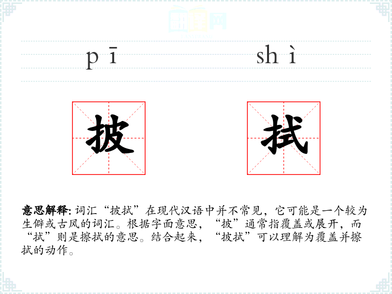 词汇“披拭”在现代汉语中并不常见,它可能是一个较为生僻或古风的词汇。根据字面意思,“披”通常指覆盖或展开,而“拭”则是擦拭的意思。结合起来,“披拭”可以理解为覆盖并擦拭的动作。