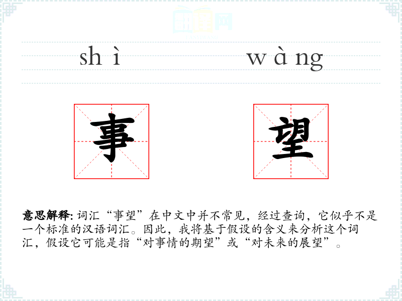 词汇“事望”在中文中并不常见,经过查询,它似乎不是一个标准的汉语词汇。因此,我将基于假设的含义来分析这个词汇,假设它可能是指“对事情的期望”或“对未来的展望”。