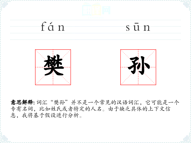 词汇“樊孙”并不是一个常见的汉语词汇,它可能是一个专有名词,比如姓氏或者特定的人名。由于缺乏具体的上下文信息,我将基于假设进行分析。