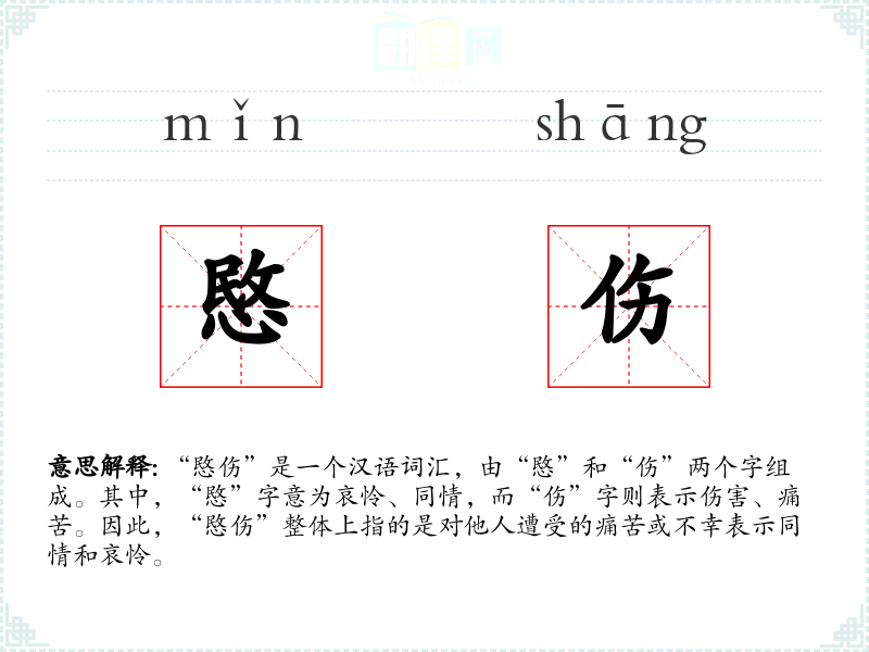 在英语中,与“愍伤”相对应的词汇可能是“compassion”或“pity”。然而,“compassion”更强调深切的同情和愿意帮助的意愿,而“pity”则可能带有一定的优越感。