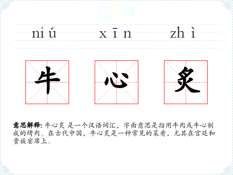 牛心炙 是一个汉语词汇,字面意思是指用牛肉或牛心制成的烤肉。在古代**,牛心炙是一种常见的菜肴,尤其在宫廷和贵族宴席上。