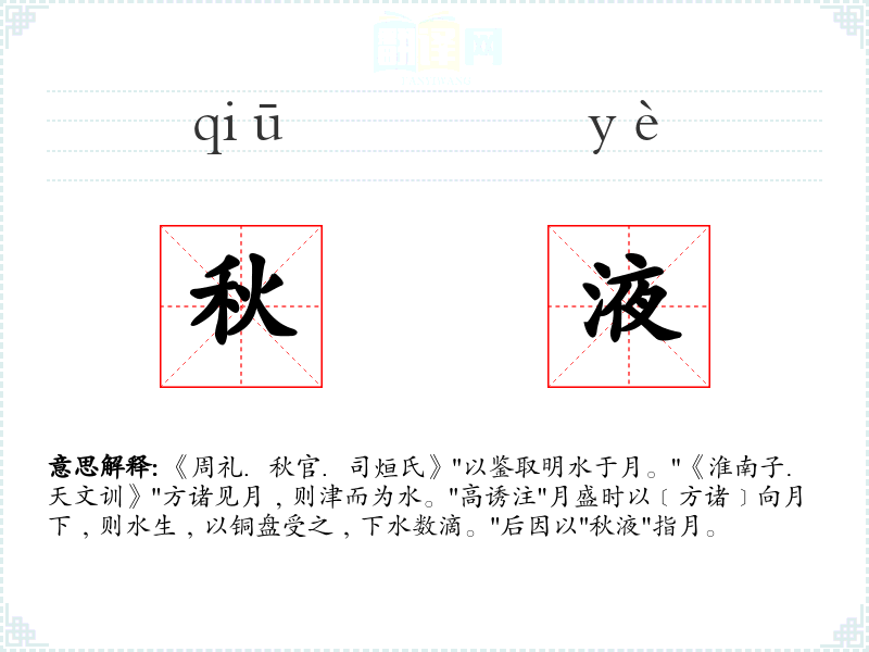 《周礼.秋官.司烜氏》"以鉴取明水于月。"《淮南子.天文训》"方诸见月﹐则津而为水。"高诱注"月盛时以﹝方诸﹞向月下﹐则水生﹐以铜盘受之﹐下水数滴。"后因以"秋液"指月。