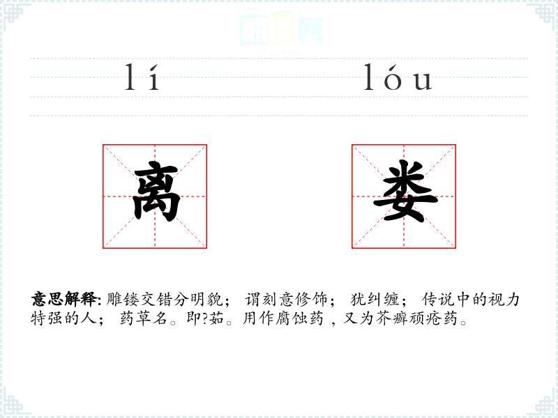雕镂交错分明貌; 谓刻意修饰; 犹纠缠; 传说中的视力特强的人; 药草名。即?茹。用作腐蚀药﹐又为芥癣顽疮药。
