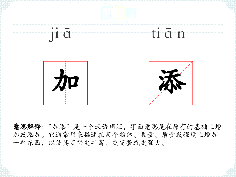 “加添”由“加”和“添”两个字组成,这两个字在古代汉语中都有增加的意思。随着时间的推移,这两个字结合在一起,形成了现代汉语中的“加添”,保留了增加和添加的基本含义。