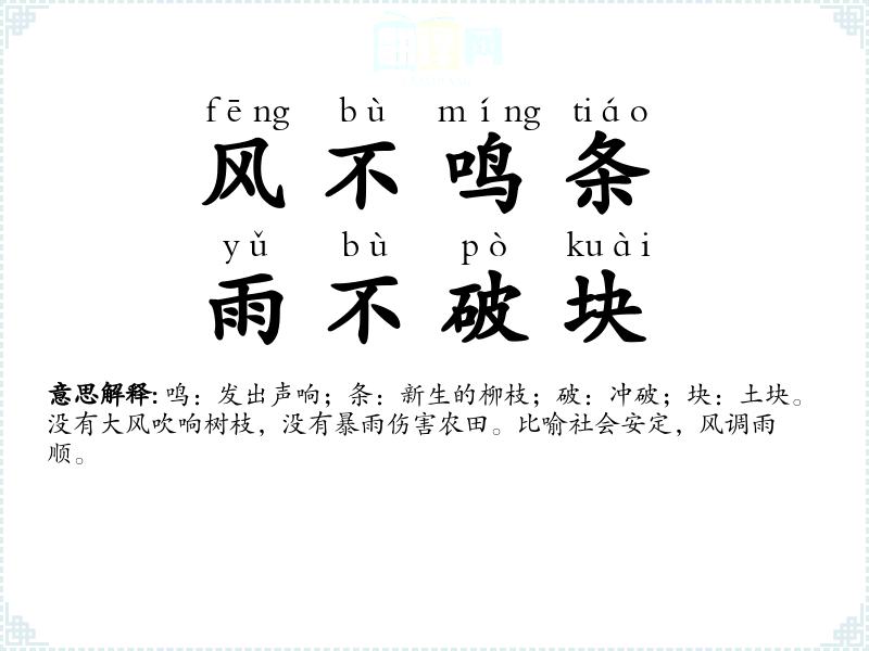 鸣:发出声响;条:新生的柳枝;破:冲破;块:土块。没有大风吹响树枝,没有暴雨伤害农田。比喻社会安定,风调雨顺。