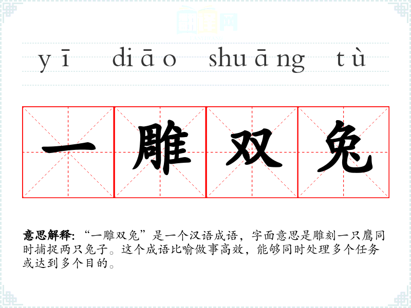 “一雕双兔”是一个汉语成语,字面意思是雕刻一只鹰同时捕捉两只兔子。这个成语比喻做事高效,能够同时处理多个任务或达到多个目的。