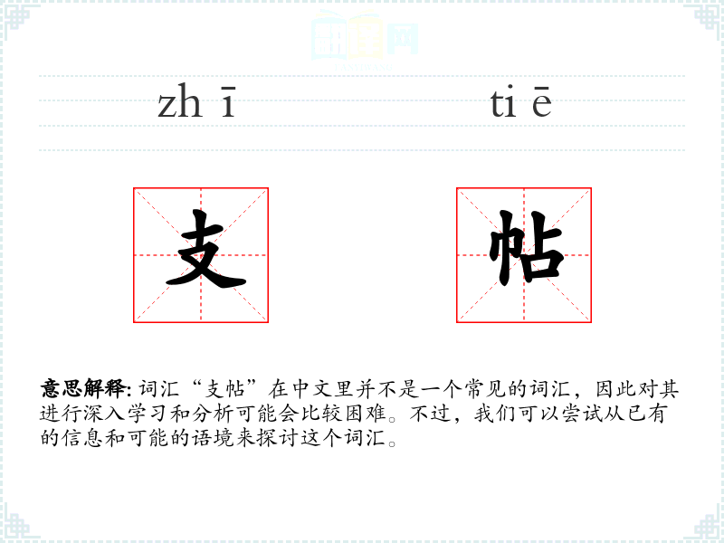 “支帖”这个词组没有明确的字面意思和基本含义,因为它不是一个标准的汉语词汇。可能是某个特定领域或方言中的词汇,或者是打字错误或网络用语。
