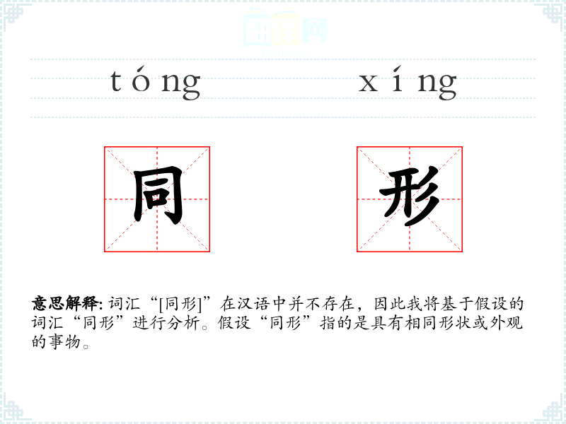 词汇“[同形]”在汉语中并不存在,因此我将基于假设的词汇“同形”进行分析。假设“同形”指的是具有相同形状或外观的事物。